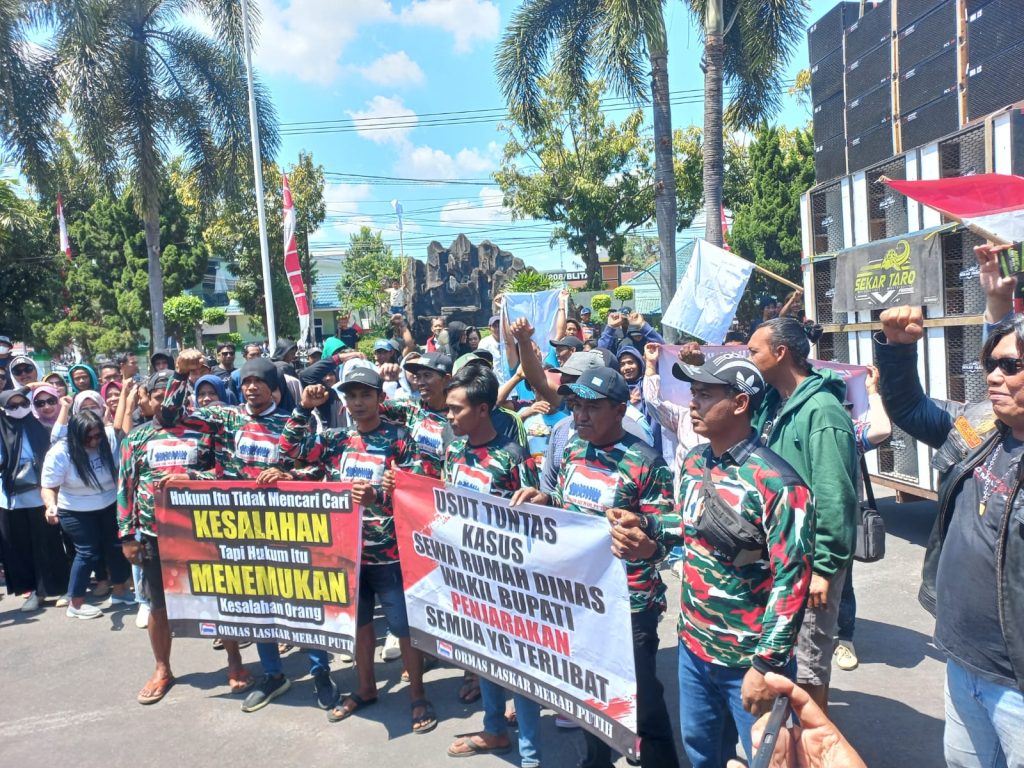 Blitar – Puluhan orang yang tergabung dalam Organisasi Masyarakat (Ormas) Laskar Merah Putih Blitar mendatangi Kantor Kejaksaan Negeri (Kejari) Kabupaten Blitar. Selain membentangkan spanduk, massa juga berorasi mendesak pengusutaj kasus dugaan korupsi sewa rumah dinas (rumdin) Wakil Bupati (Wabup) Blitar.
