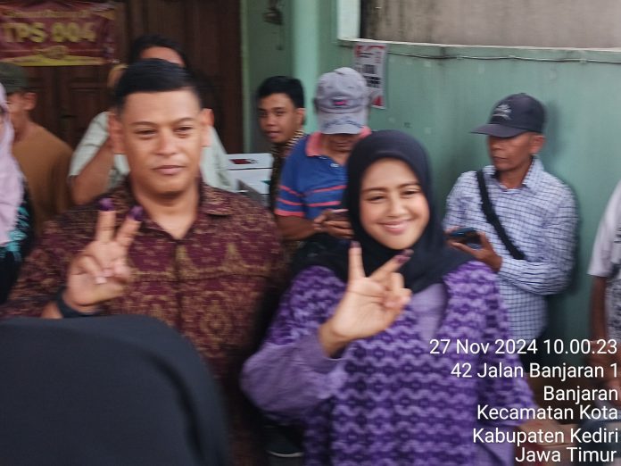 Ferry Silviana Feronica yang juga Calon Walikota Kediri pasangan FREN ini datang di TPS sekitar Pkl 10.00 Wib dengan di dampingi suaminya dan juga calon Wakilnyanya yakni Regina Nadya Suwuno beserta sejumlah rombongan lainya