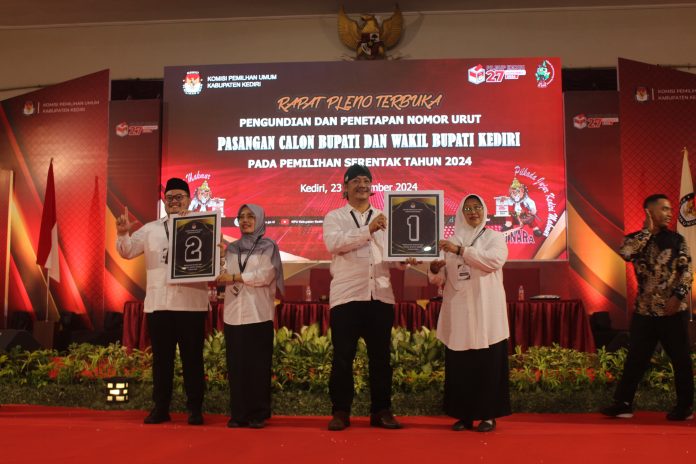 Kediri, ( adakitanews.id ) – Komisi Pemilihan Umum (KPU) Kabupaten Kediri menggelar rapat pleno terbuka pengundian dan deklarasi kampanye damai pasangan calon bupati dan wakil bupati Kediri untuk Pilkada serentak di Gedung Bhagawanta Bhari, pada Senin (24/09).