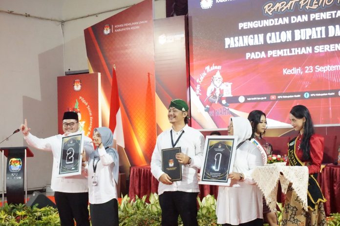 Kediri, ( adakitanews.id ) – Komisi Pemilihan Umum (KPU) Kabupaten Kediri menggelar rapat pleno terbuka pengundian dan deklarasi kampanye damai pasangan calon bupati dan wakil bupati Kediri untuk Pilkada serentak di Gedung Bhagawanta Bhari, pada Senin (24/09).