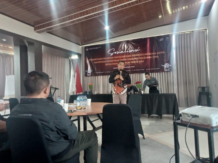 Adakitanews.id Kediri, (24/11/2023) – Dengan menghadirkan beberapa elemen masyarakat yang ada di wilayah Kabupaten Kediri, yaitu Pers , Tokoh Agama, Parpol dan Kepemudaan serta Perwakilan organisasi masyarakat bahkan dihadiri dari pihak FORKOPIMDA Kabupaten Kediri, KPU Kabupaten Kediri melakukan sosialisasi pembentukan kelompok penyelenggara pemungutan suara (KPPS) dan petugas Ketertiban tempat pemungutan suara (TPS) untuk pemilu tahun 2024 mendatang, yang dipimpin Komisioner Anwar dan Nanang Qosim devisi SOSDIKLIH PARMAS dan SDM.