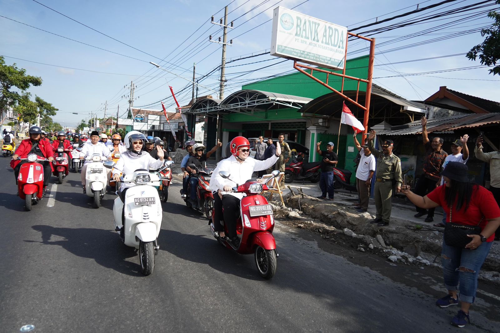 Dengan mengendarai sepeda motor Mas Dhito dan Mbak Dewi berangkat dari posko pemenangan menuju kantor KPU Kabupaten Kediri dengan dikawal pendukungnya bersama ketua parpol partai pengusungnya.