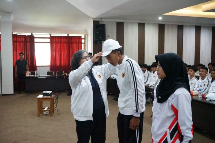 Pelepasan atlet yang akan mengikuti ajang Popda XIV dan Peparperda II ditandai dengan penyematan atribut oleh Pj Wali Kota Kediri.