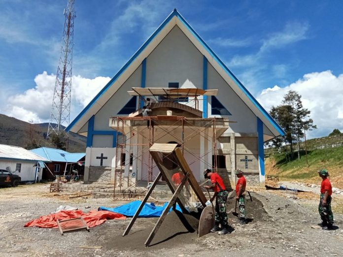 Salah satunya, seperti adanya percepatan pembangunan Gereja yang dilakukan oleh Satgas di Kampung Bakon, Distrik Tiom, Kabupaten Lanny Jaya, Papua. Minggu (05/11/2023).