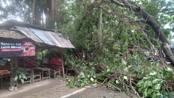 BPBD Kota Kediri begitu mendapatkan laporan segera gerak cepat melakukan evakuasi dengan memotong bagian pohon yang menghalangi jalan serta yang menimpa atap warung. Proses evakuasi berlangsung dengan tertib, aman, dan lancar.