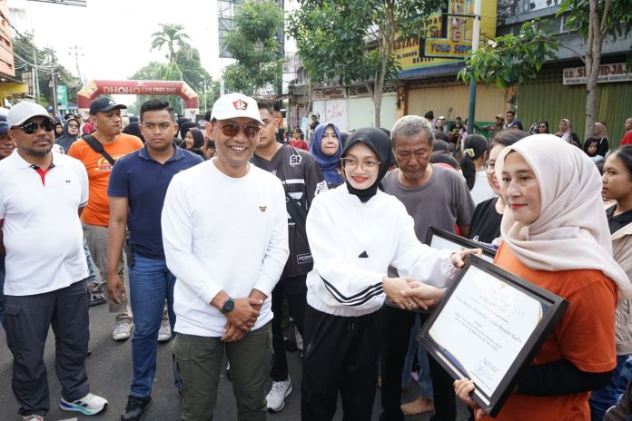 Kediri, (adakitanews.id) – Wali Kota Kediri Vinanda Prameswati membagikan buku kepada anak-anak yang mengikuti aksi membaca buku serentak di Car Free Day Jalan Dhoho, Minggu (25/05/2025). Kegiatan ini dalam rangka memperingati Hari Buku dan Hari Kearsipan Nasional. Baca buku serentak ini diikuti oleh anak-anak sekolah dasar, forum anak, dan komunitas. Perempuan yang akrab disapa Mbak Wali ini juga berinteraksi dengan anak-anak. Terkait kegiatan membaca yang dilakukan anak-anak.