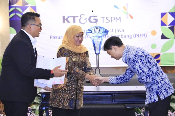 Surabaya (Adakitanews.id) – Gubernur Jawa Timur, Khofifah Indar Parawansa, menyaksikan secara langsung penandatanganan Perjanjian Penggunaan Tanah Industri (PPTI) antara Direktur PT Surabaya Industrial Estate Rungkut (SIER) Didik Prasetiyono dengan Wakil Direktur Utama PT. Tri Sakti Purwosari Makmur (TSPM) yang merupakan anak perusahaan Korea Tomorrow & Global Corporation (KT&G) Jang Jaehong, di Surabaya, Selasa, (19/9/2023).