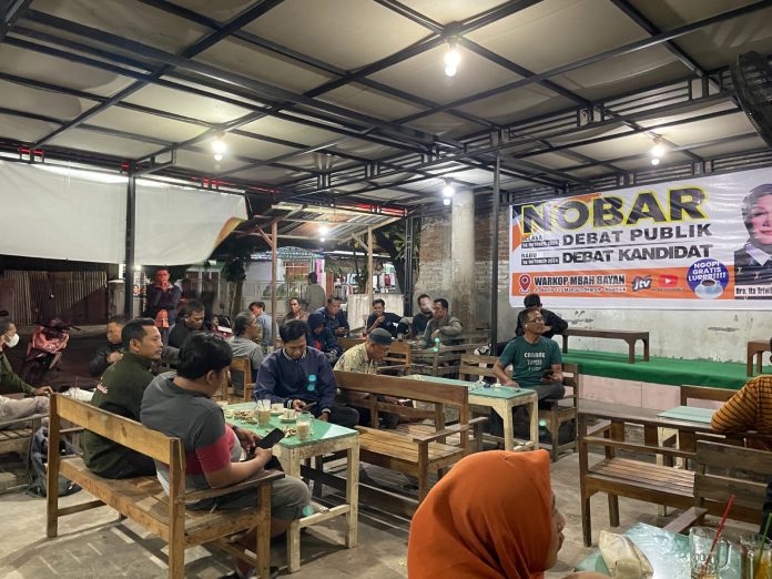 Nganjuk, (adakitanews.id) – Sejumlah warga Kabupaten Nganjuk menghadiri acara nonton bareng (nobar) debat calon Bupati Nganjuk 2024 yang digelar di Warung Mbah Bayan pada Rabu, 16 Oktober 2024. Acara nobar ini diselenggarakan oleh relawan paslon nomor urut 02, Ita Triwibawati dan Zuli Rantauwati, dengan fasilitas kopi gratis bagi para penonton.